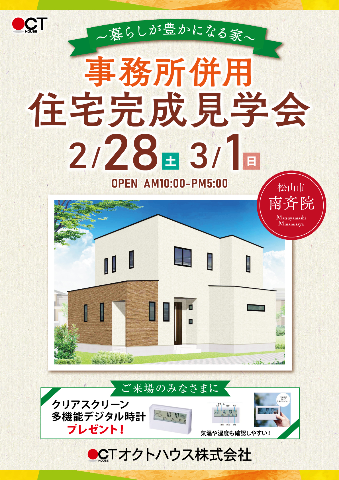 | 見どころ | ~暮らしが豊かになる家~ 事務所併用住宅完成見学会in松山市南斎院 2月28日~3月1日 AM10:00~PM17:00 🏠 働く×暮らすをスマートに 事務所スペースを備えた兼用住宅。 来客対応もしやすく、プライベート空間はしっかり確保。 🧺 家事ラクを叶えるランドリールーム 洗う・干す・畳むが一か所で完結。 毎日の洗濯動線をぐっと短縮。 🚪 土間収納でスッキリ玄関 アウトドア用品・仕事道具もそのまま収納。 汚れを気にせず出し入れ可能。 👗 広々ウォークインクローゼット 家族みんなの衣類をまとめて収納。 季節物も余裕でしまえる大容量設計。 機能性も、快適さも妥協しない住まい。 |